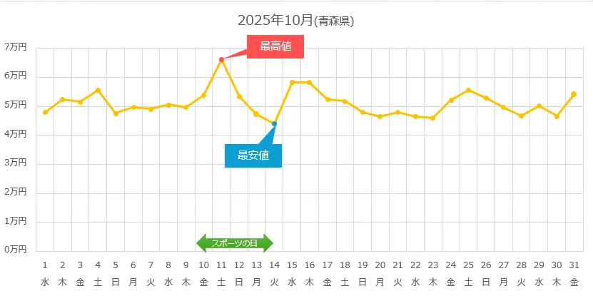 2025年10月の青森旅行2泊3日の最安値・最高値・平均費用を確認