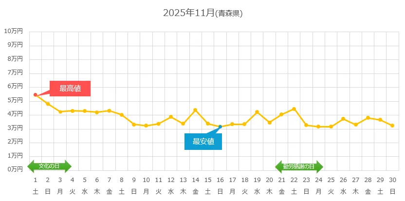 2025年11月の青森旅行2泊3日の最安値・最高値・平均費用を確認