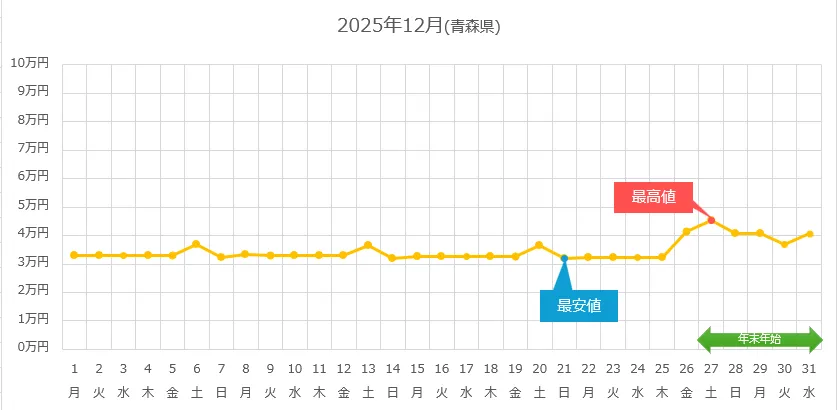 2025年12月の青森旅行2泊3日の最安値・最高値・平均費用を確認