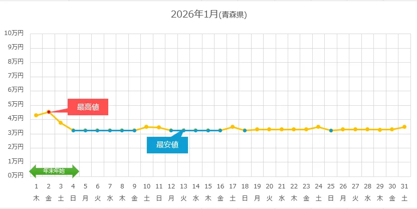 2026年1月の青森旅行2泊3日の最安値・最高値・平均費用を確認