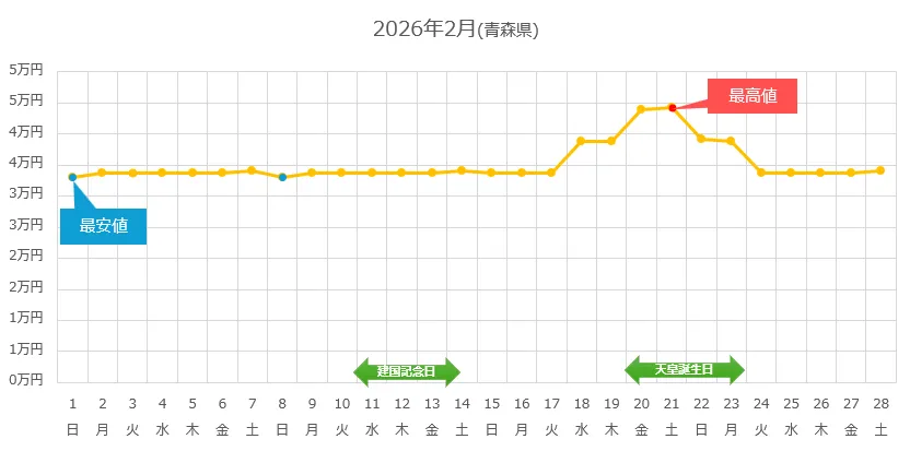 2026年2月の青森旅行2泊3日の最安値・最高値・平均費用を確認