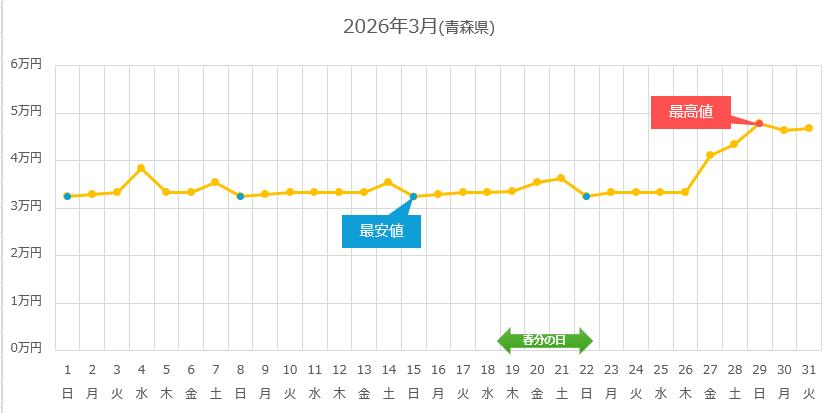 2026年3月の青森旅行2泊3日の最安値・最高値・平均費用を確認