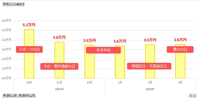 シルバーウィーク(敬老の日・秋分の日)を過ぎたあたりから金額が下がっていき、下旬の29日が最安値となっています。