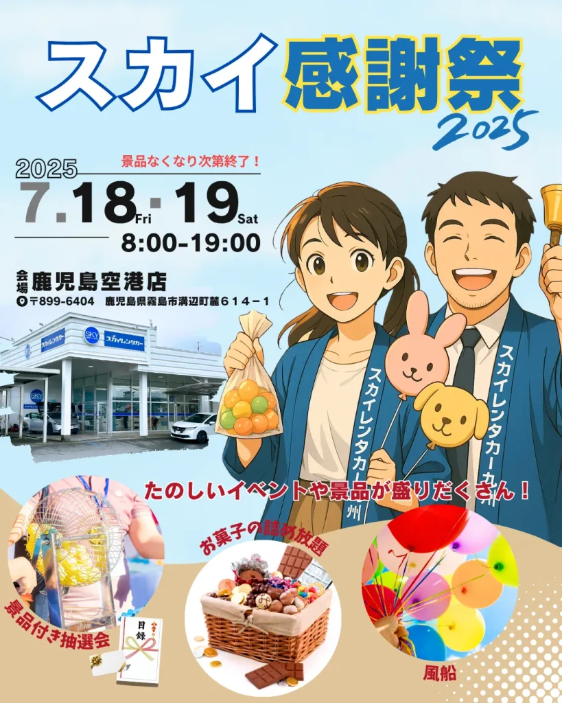 感謝祭のお知らせ 日頃より【スカイレンタカー九州】をご愛顧いただき、誠にありがとうございます。皆さまへの感謝の気持ちを込めて、以下の通り「感謝祭」を開催いたします。 場所:スカイレンタカー鹿児島空港店〒899-6404 鹿児島県霧島市溝辺町麓614-1... -