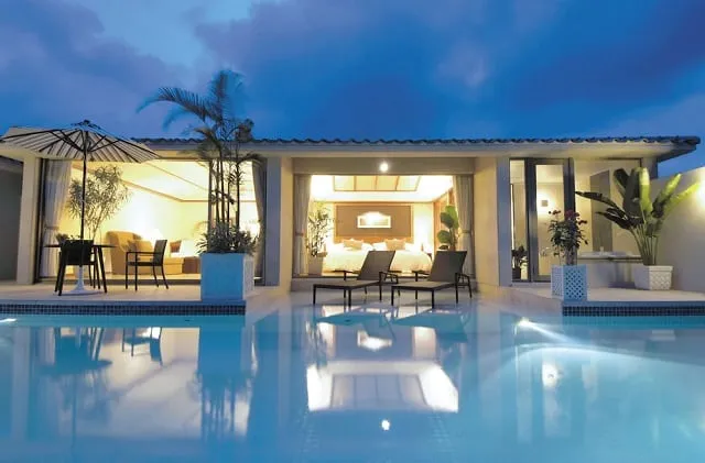 プライベートプールを挟んで、リビングルームとベッドルームが配されています。プールサイドにはジェットバスも。