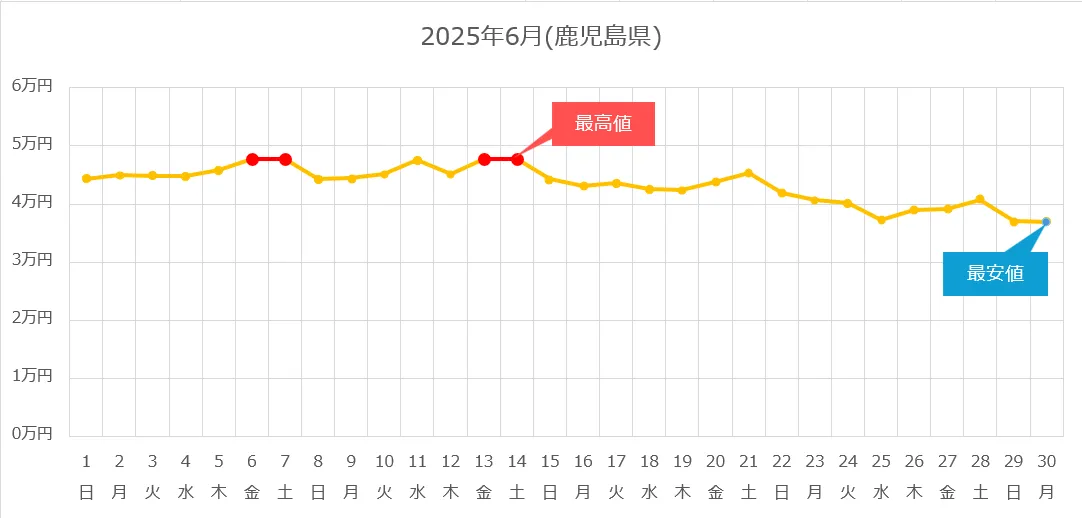 2025年6月の鹿児島旅行2泊3日の最安値・最高値・平均費用を確認