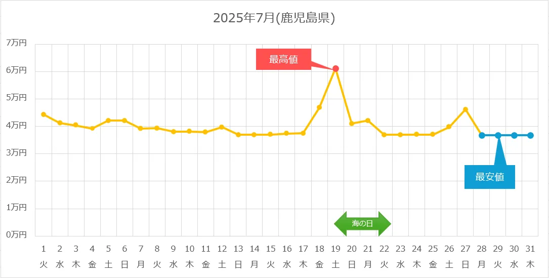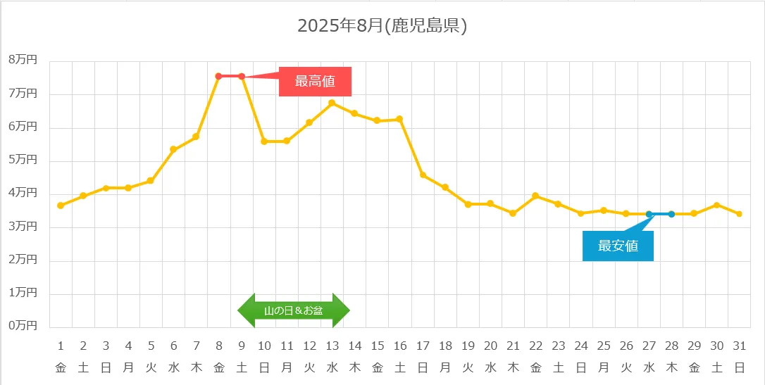 鹿児島旅行のハイシーズンである7月~8月の夏休みシーズン、ゴールデンウィーク、シルバーウィーク、年末年始などはもちろん高くなりますが、そのハイシーズン中も日によって料金が大きく変動します。