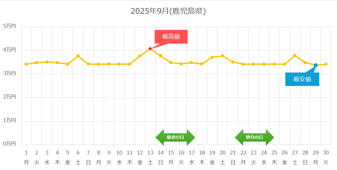 2025年9月の鹿児島旅行2泊3日の最安値・最高値・平均費用を確認