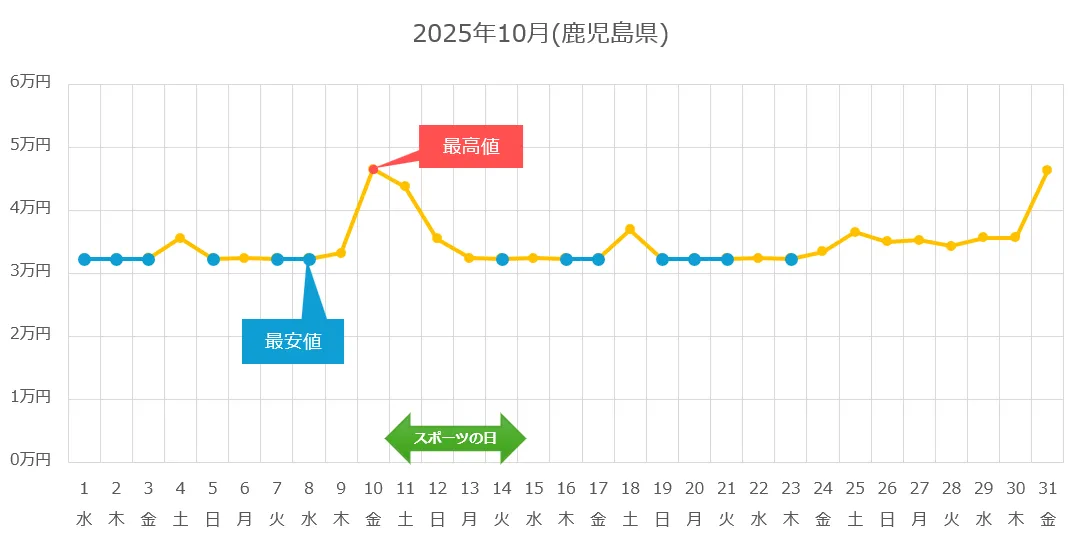 2025年10月の鹿児島旅行2泊3日の最安値・最高値・平均費用を確認