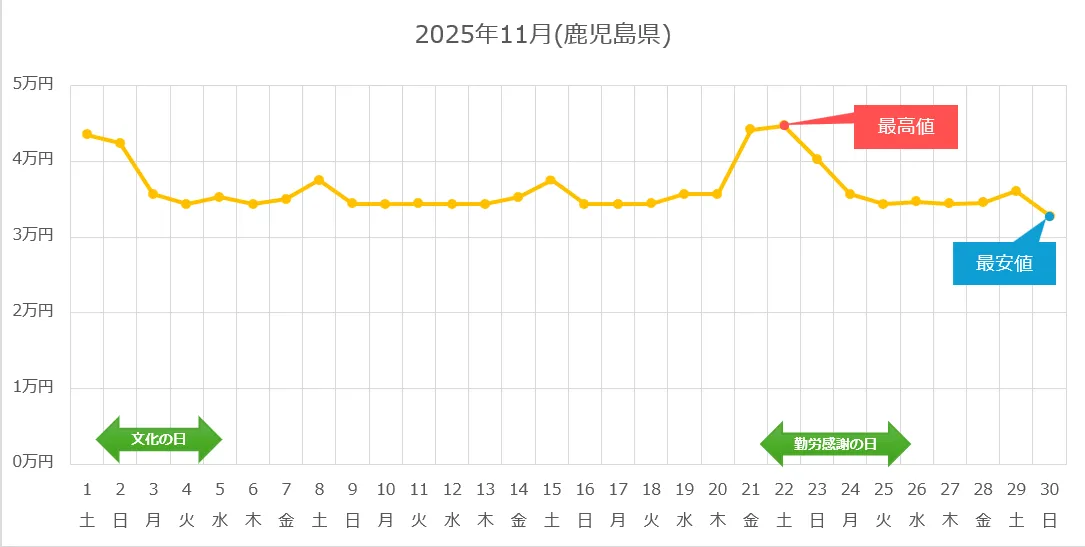 2025年11月の鹿児島旅行2泊3日の最安値・最高値・平均費用を確認