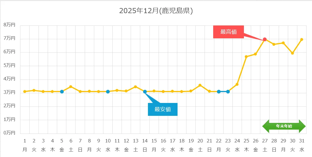 2025年12月の鹿児島旅行2泊3日の最安値・最高値・平均費用を確認