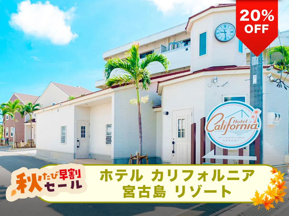 【秋たび早割セール対象20%OFF】アメリカ西海岸をイメージした自由なホテルスタイルで宮古島を満喫♪全室キッチン・洗濯機完備、長期滞在歓迎◎ホテル敷地内にゴルフシュミレーション完備(有料)雨天時に最適!「ホテル カリフォルニア 宮古島リゾート」と航空券のリゾートパッケージプラン
