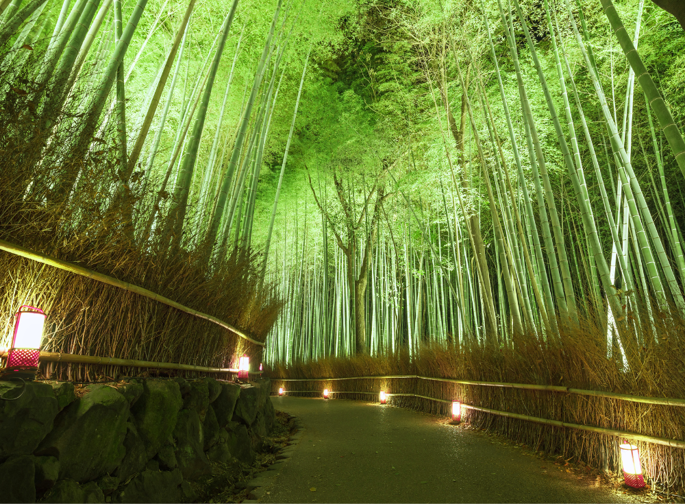 野宮神社から大河内山荘へ抜ける約400mの道を、美しい竹林が空を覆うように立ち並びます。