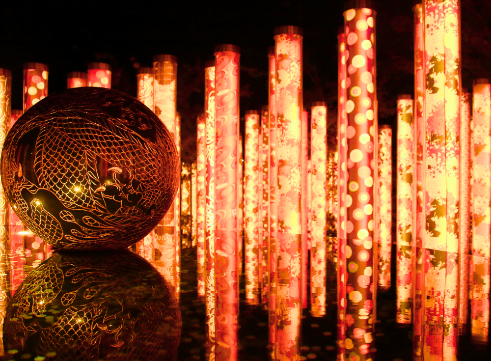 ポールにはLEDライトが入っており、夜間ライトアップでは幻想的な和の光を楽しめます。