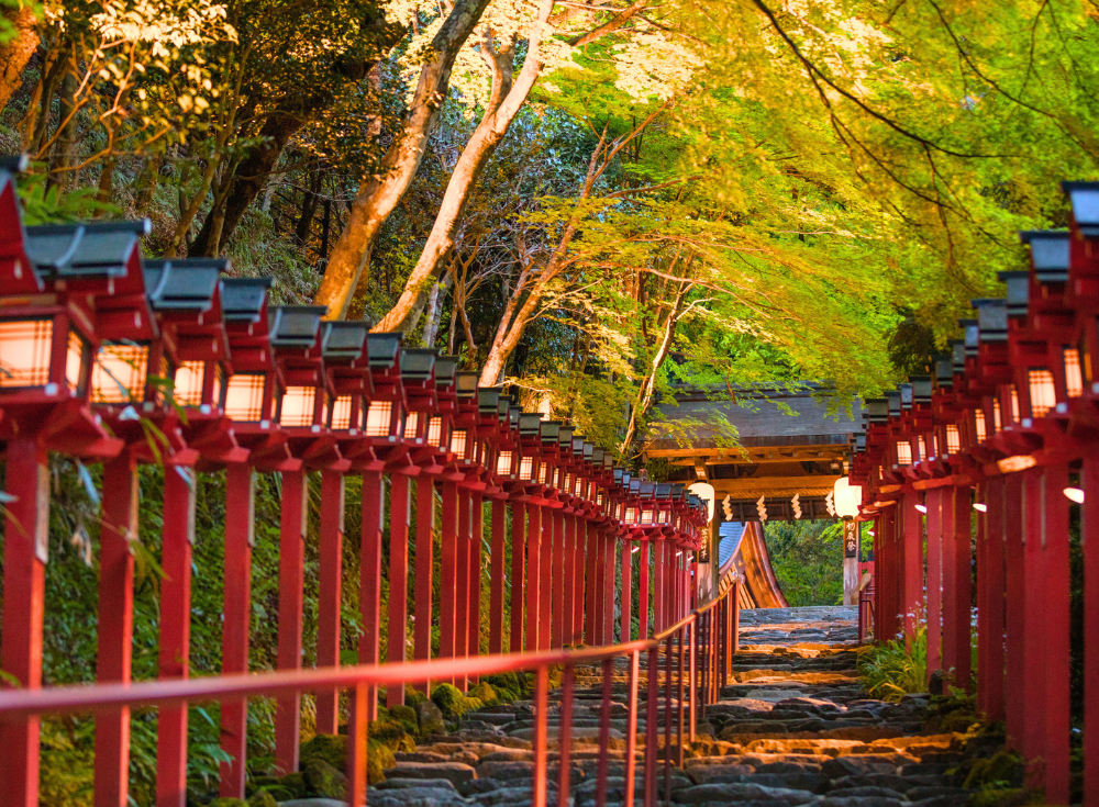 神社の境内へ続く赤い春日灯篭が連なる参道は有名で、貴船を代表する風景です。