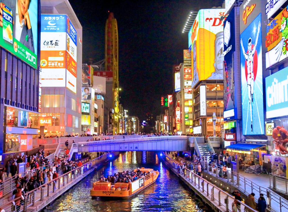 ひときわ目立つ巨大看板が軒を連ね、道頓堀のエネルギッシュなパワーを象徴しています。