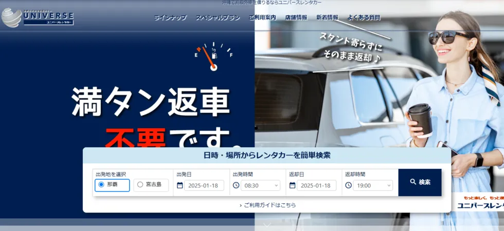 ユニバースレンタカー那覇空港店の「ガソリン満タン不要プラン」なら、スタンドを探す手間なく返却でき、時間を有効活用できます。