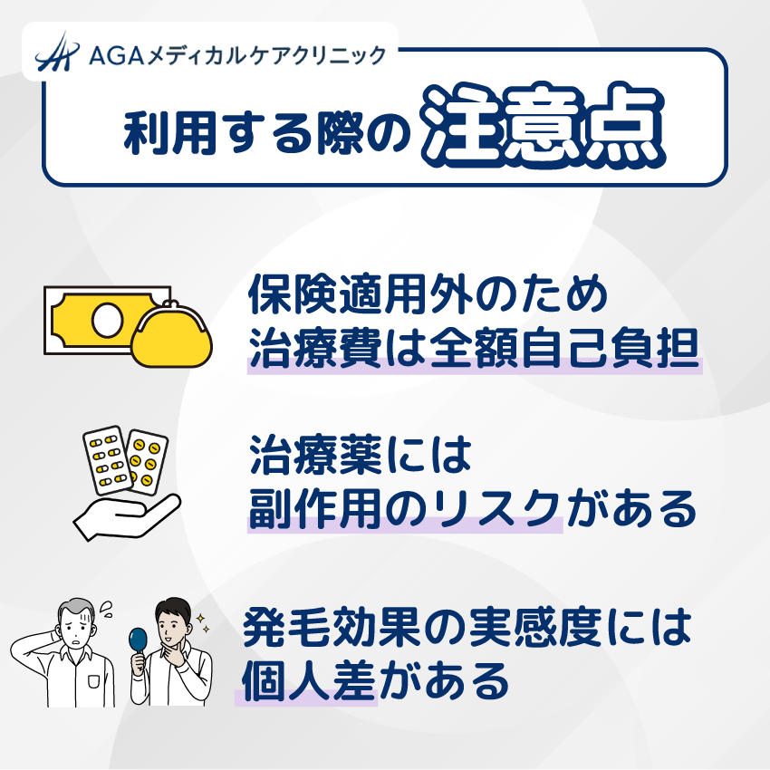 AGAメディカルケアクリニックのAGA治療を利用する際は、以下3つの注意点を知っておきましょう。