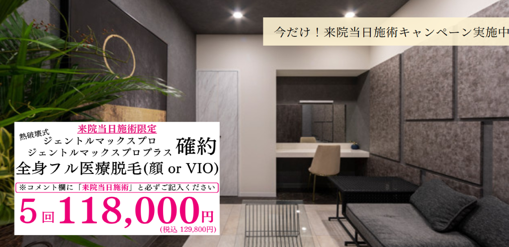 来院当日施術限定キャンペーンを利用すると、全身フル脱毛(VIOまたは顔を含む)および全身フル脱毛(VIO・顔を含む)の1回分の料金が実質無料になります。