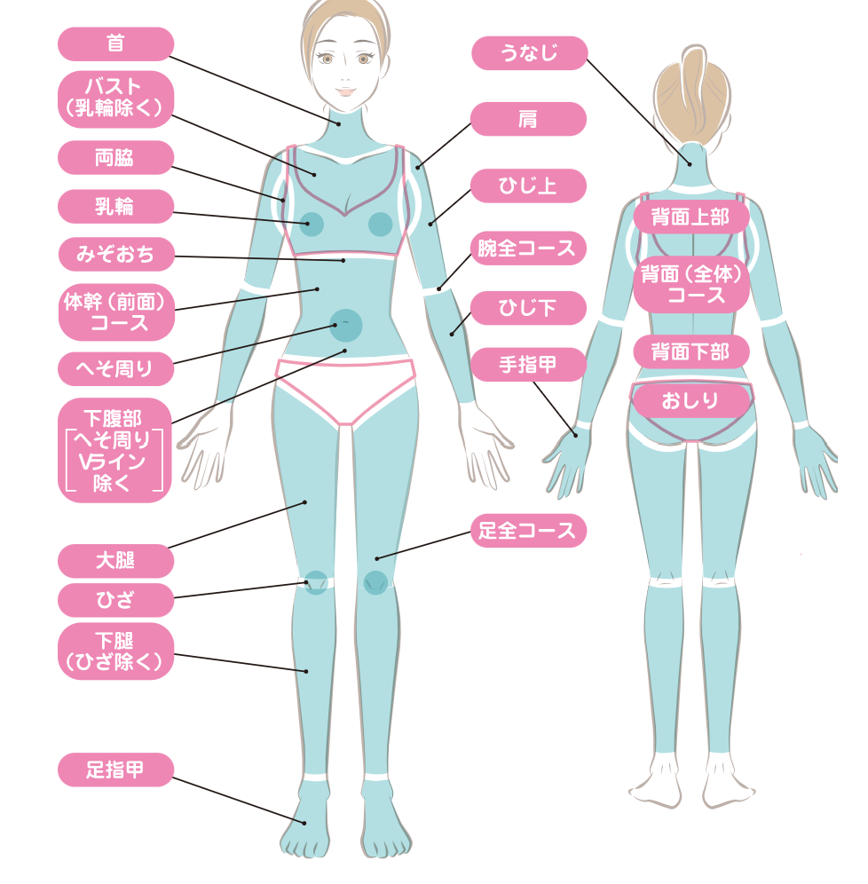 特に首・指先・乳輪周り・腹部・お尻といった他院で施術対象外となりやすい部位も含まれているため、隅々までの脱毛を希望する方に最適です。