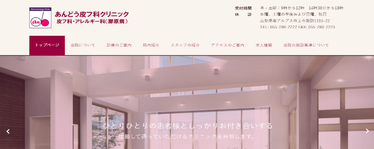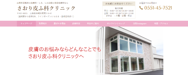 | クリニック | ![]() ![]() TCB東京中央美容外科 山梨甲府駅前院 | 甲府昭和形成外科クリニック | さおり皮ふ科クリニック | 藤井平皮膚科 | なでしこ皮フ科 |