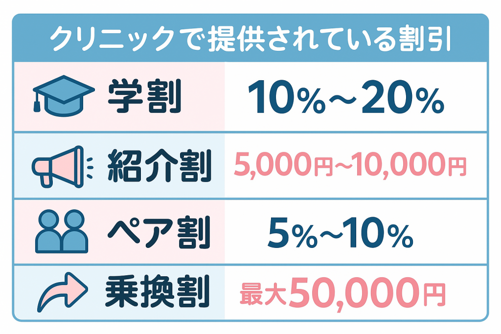 また、学生向けの10%OFF、友人と一緒の来院で適用されるペア割10%OFF、他院からの乗り換えで適用される10%OFFなど、様々な割引制度も充実しています。