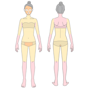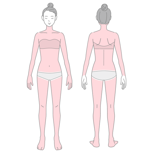 服から見えにくい範囲の全身10部位(首・ワキ・二の腕・胸・胸中央・背中下部・お腹・へそ・お尻・太もも)
