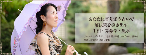 鑑定料金 | 手相と算命学鑑定 60分 / 10,000円(人生グラフ、鑑定書付) 30分 / 5,000円 手相 20分 / 3,000円 オンライン鑑定(手相と算命学鑑定) 60分 / 10,000円 30分 / 5,000円 香り風水鑑定 90分 / 30,000円(アロマ香水付き) |