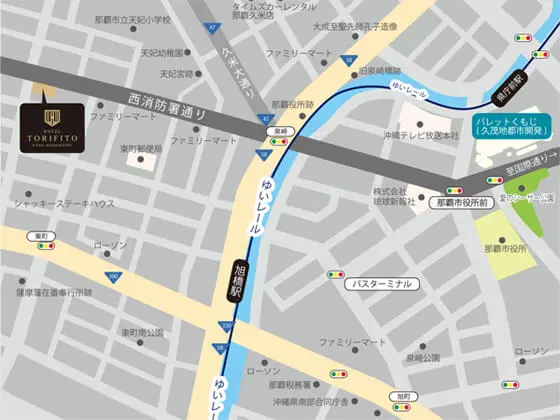 国道58号線を那覇市街方面へ進み、泉崎交差点を左折。西消防署通りを約300mほど直進すると、左手側にホテルがあります。