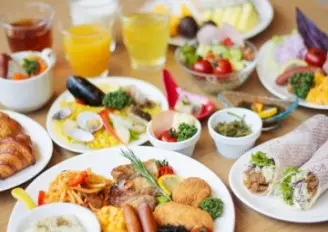 朝食はバイキング形式です(有料)。共用エリアの電子レンジもご利用頂けます。最寄りのコンビニは徒歩1分、周辺に飲食店も充実しています。