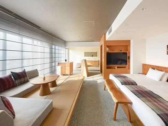 デラックスツイン高層階に位置する、ゆったりとした間取りのツインルーム。幅広のバルコニーと大きな窓付きのバスタブが特徴です。
