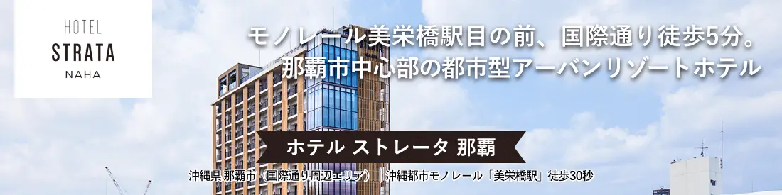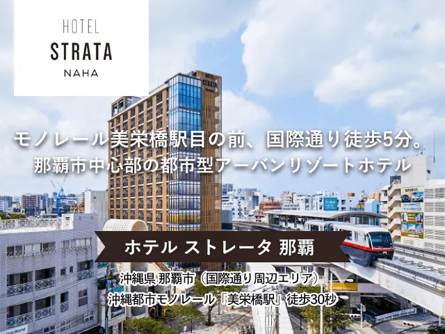 ホテル ストレータ 那覇 までのアクセスは、沖縄都市モノレール(ゆいレール)「美栄橋駅」から徒歩30秒です。那覇空港から美栄橋駅までモノレールで14分。空港から車をご利用の場合、約15分で到着します。