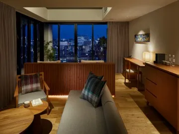 エグゼクティブスイート14階から海を望むコンパクトなスイートルーム。窓際の大きなロングソファを利用して最大4名様までご宿泊いただけます。