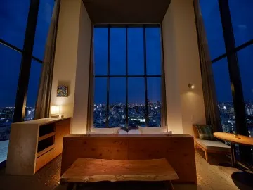 パノラマスイート3面ガラス張りの吹き抜け天井から那覇市街地を一望。まるで街並みの中に浮かぶような感覚が味わえます。11階と13階の角部屋に位置する特別なお部屋です。