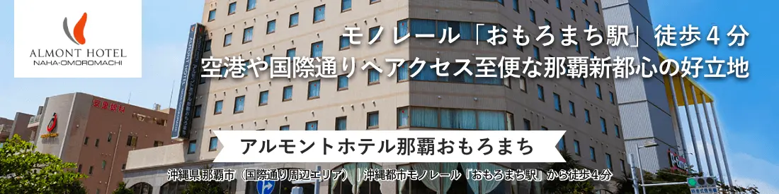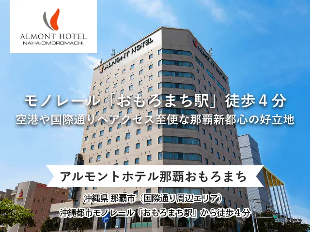 アルモントホテル那覇おもろまち までのアクセスは、那覇空港から沖縄都市モノレールで19分。ゆいレール「おもろまち駅」下車徒歩4分です。国際通り(牧志駅)から2駅3分で到着します。