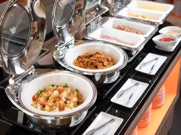 朝食はバイキング形式です(有料)。館内にレストランがあります。共用エリアの電子レンジもご利用いただけます。