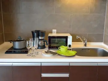 お食事とお飲み物 - 冷蔵庫、コンロ、および電子レンジを備えた簡易キッチン