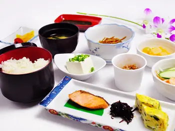 優しい光りが注ぎ込む緑に囲まれたオープンテラスでの朝食が人気です。ご利用日によって「和洋バイキング」と「和定食」のいずれかをご用意いたします。