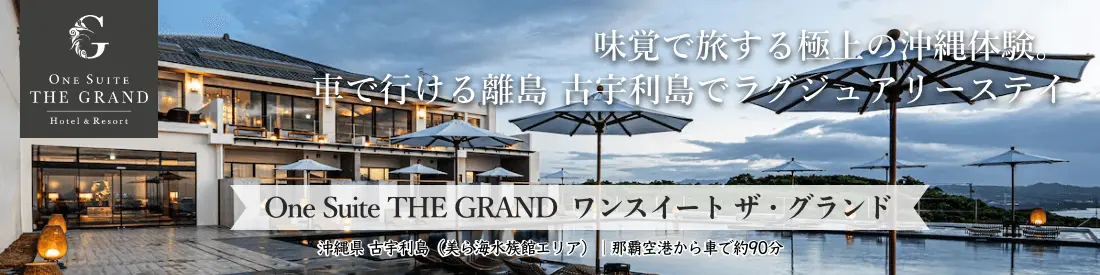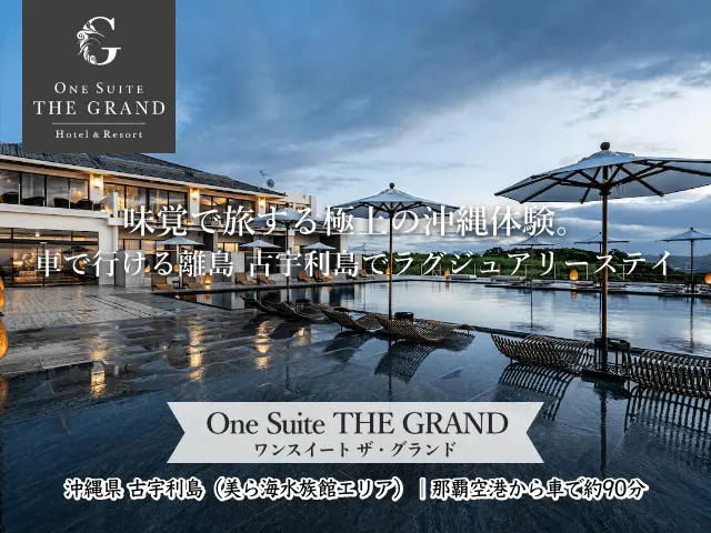 One Suite THE GRAND(ワンスイート ザ・グランド) までのアクセスは、那覇空港から高速道路(沖縄自動車道)経由で約90分です。「許田IC」から名護東道路、屋我地島を通り、古宇利島まで約30分で到着します。