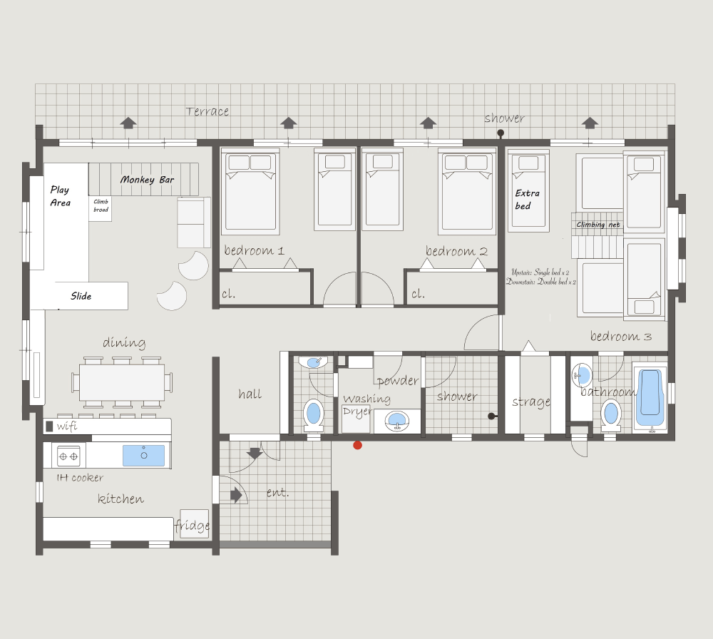 room3:ダブルベッド2(下段)・シングルベッド2(上段)・シングルエキストラベッド1