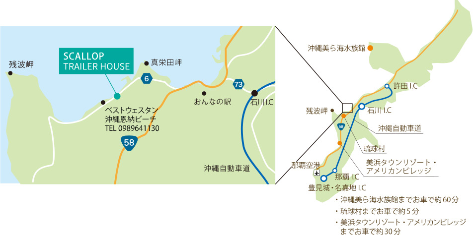 【那覇空港から沖縄自動車道経由で約50分】那覇空港自動車「豊見城・名嘉地IC」または沖縄自動車道「那覇IC」から北上、「石川IC」を降りて県道6号を恩納村(真栄田)、国道58号を一部経由して読谷方面へ。