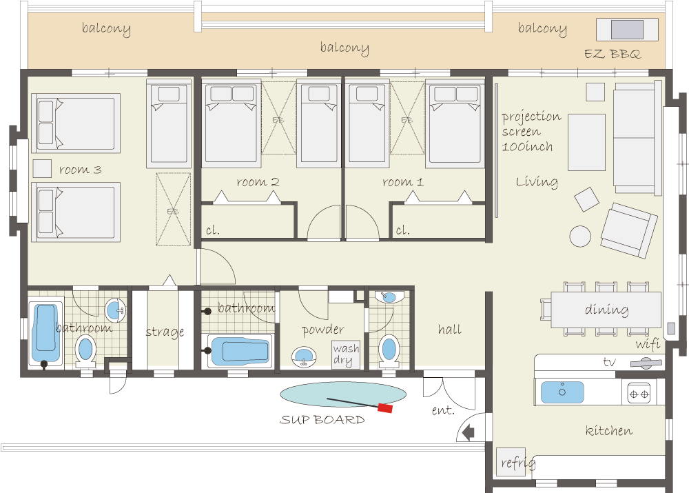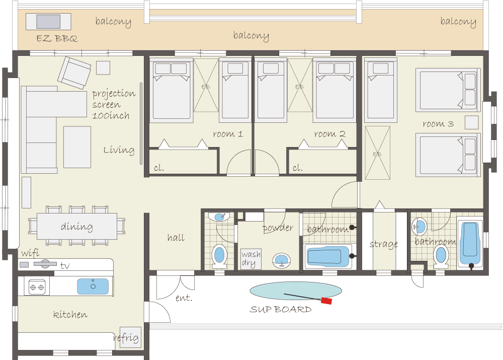 充実した施設で暮らすように旅をする必要な備品はもちろん、キッチン用品も充実。 アクティビティアイテムも揃っています。 テラスにはバーベキューセット、プライベートなベッドルーム。 自由な感覚で暮らすように楽しめます。