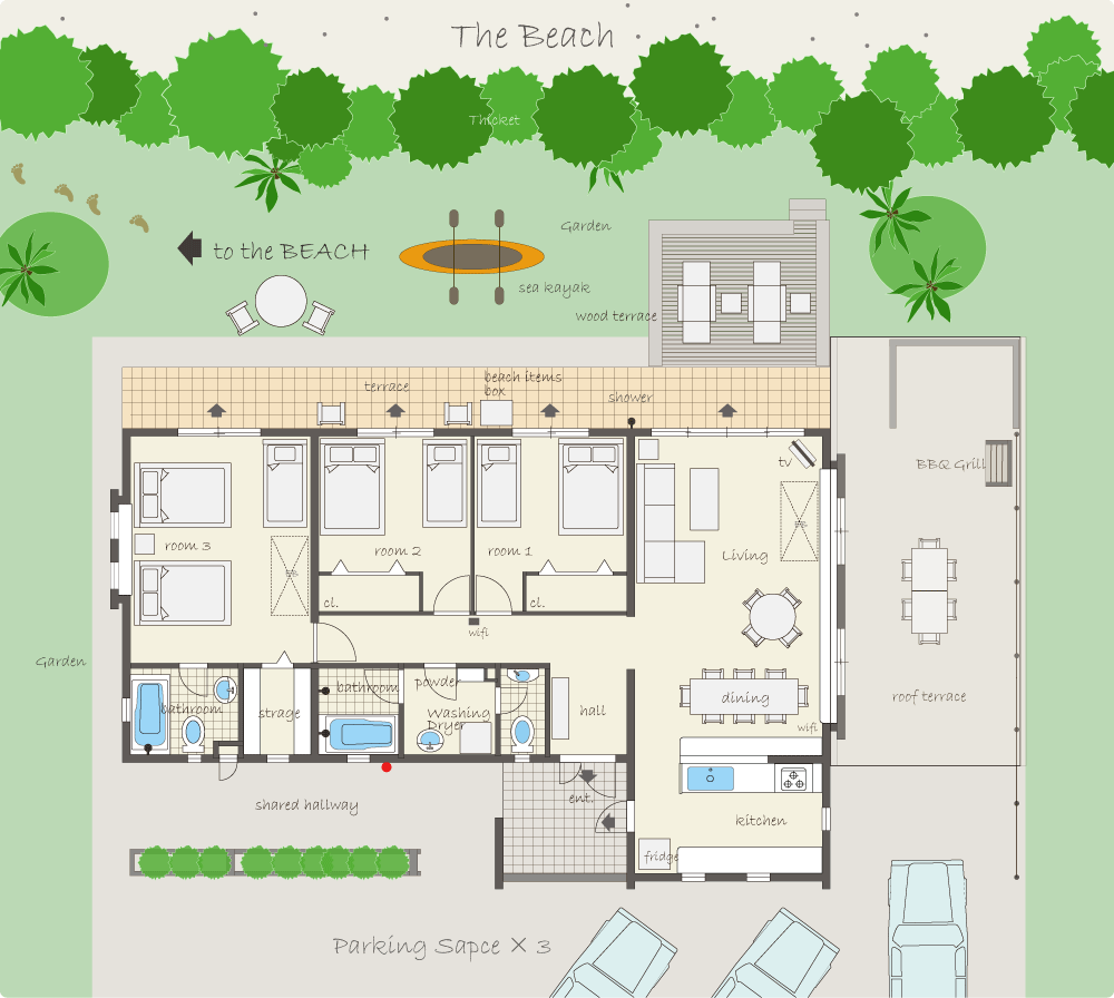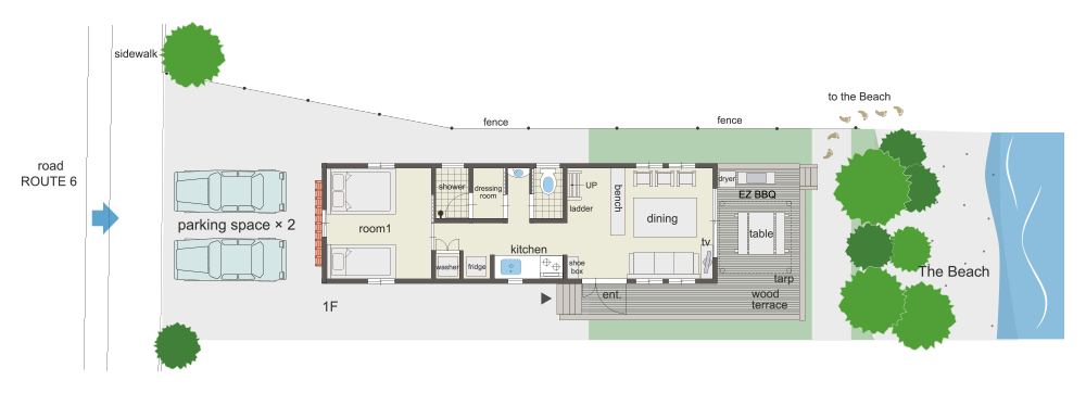 海まで歩いて30秒で、安心してお部屋と海を行き来できます。