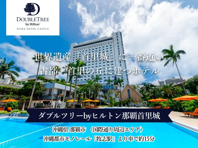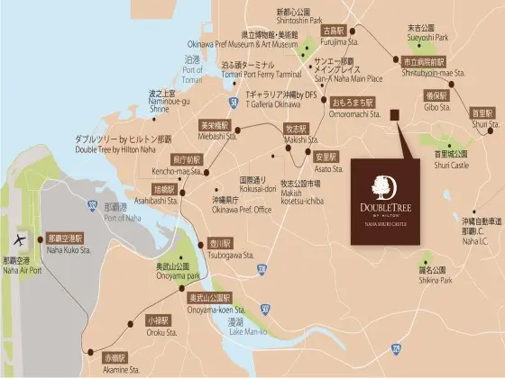 ダブルツリーbyヒルトン那覇首里城 までのアクセスは、那覇空港から沖縄都市モノレール「牧志駅」まで16分、ゆいレール「牧志駅」を降りて車で約15分です。那覇空港から車をご利用の場合、約30分で到着します。