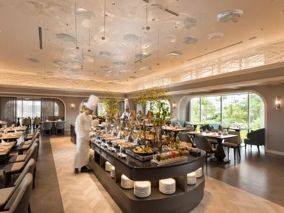 朝食はビュッフェ形式です(有料)。館内に3つのレストランや、バー・ラウンジ、季節限定プールサイドバーベキューがあります。