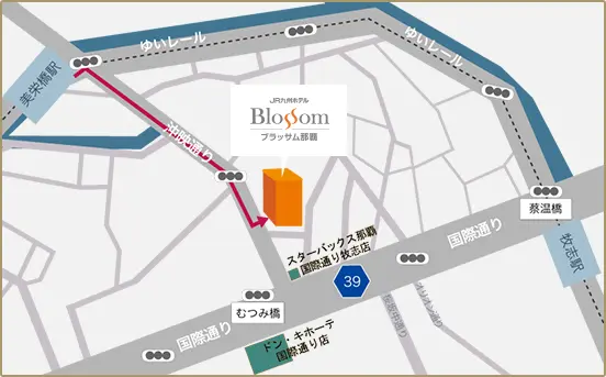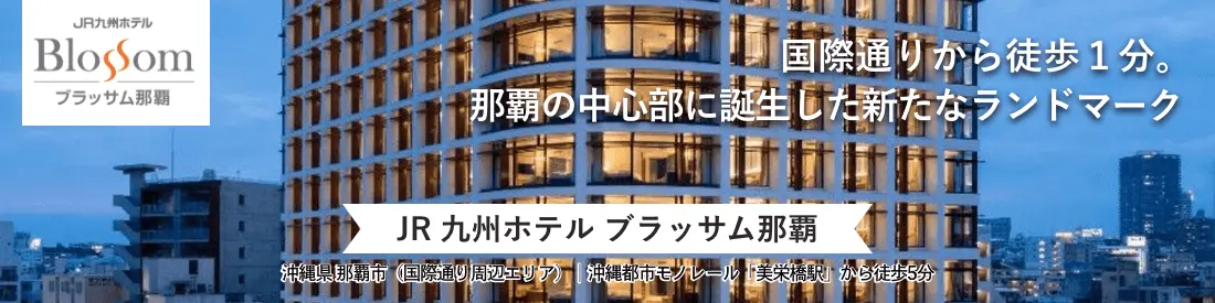 JR九州ホテル ブラッサム那覇 までのアクセスは、那覇空港からモノレールで14分、ゆいレール「美栄橋駅」下車徒歩5分です。空港からお車をご利用の場合、約15分で到着します。