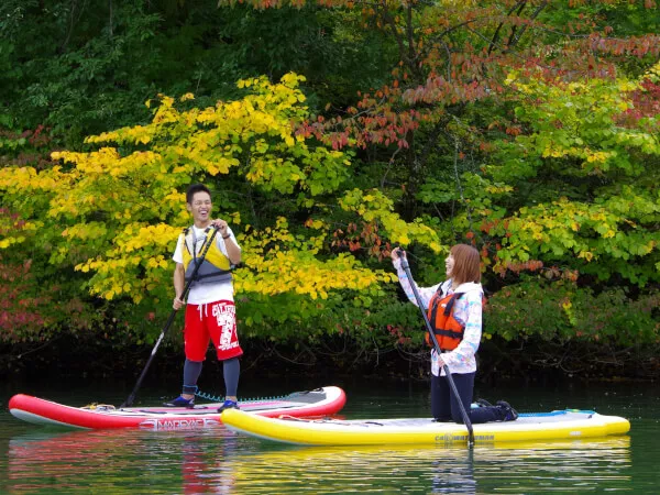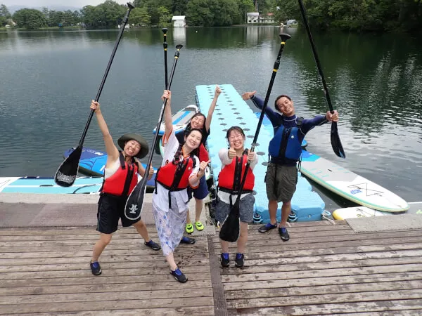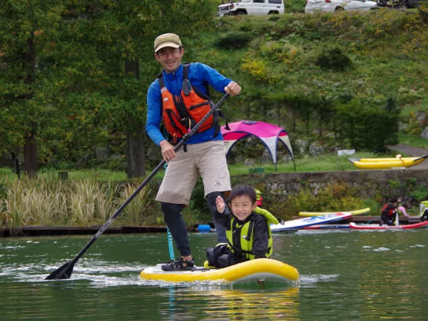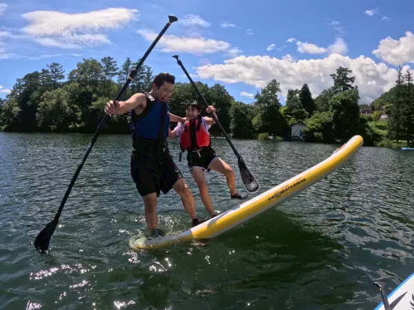 湖に漕ぎ出そう! 湖上前半はSUPの乗り方、漕ぎ方、遊び方をレッスンします。