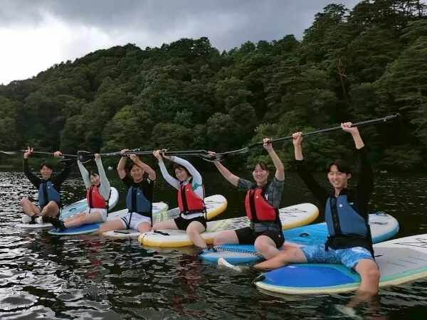 湖上後半はフリータイム! 仲間で乗って、相撲、連結SUP、テールターンなどSUPに乗って自由に楽しもう!