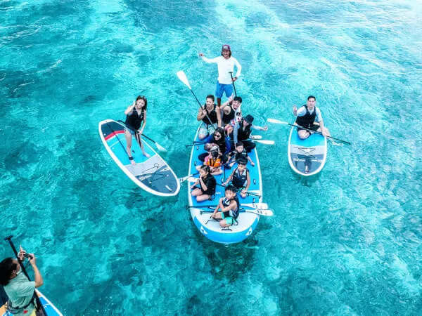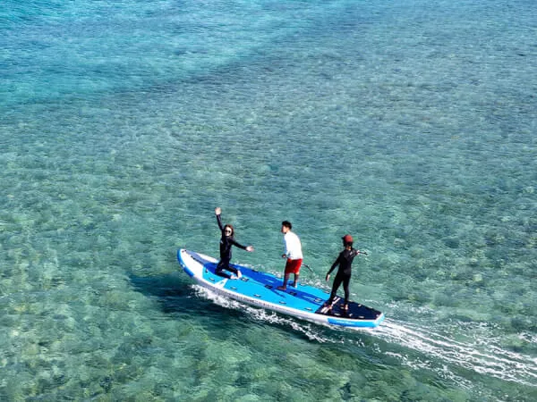 1枚の大きなSUPにみんなで乗るから、チームワークがカギ。友達や家族とワイワイ楽しめます!