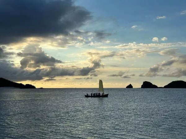 沖縄で古くから使われていた木造船。ウェークという櫂で漕ぎ、帆で風を受け進む舟。自然を感じながらのクルージングは最高のひととき。